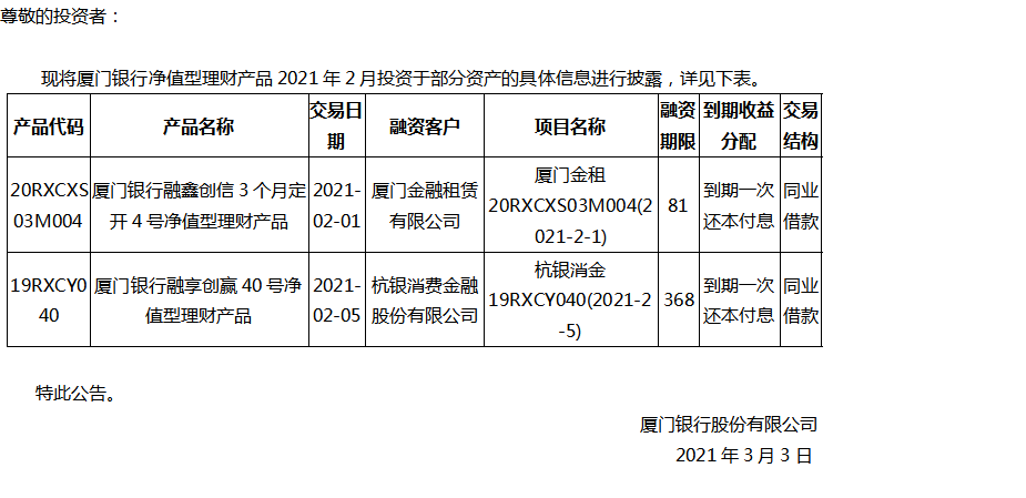 關(guān)于廈門銀行凈值型理財(cái)產(chǎn)品2021年2月投資部分資產(chǎn)的公告