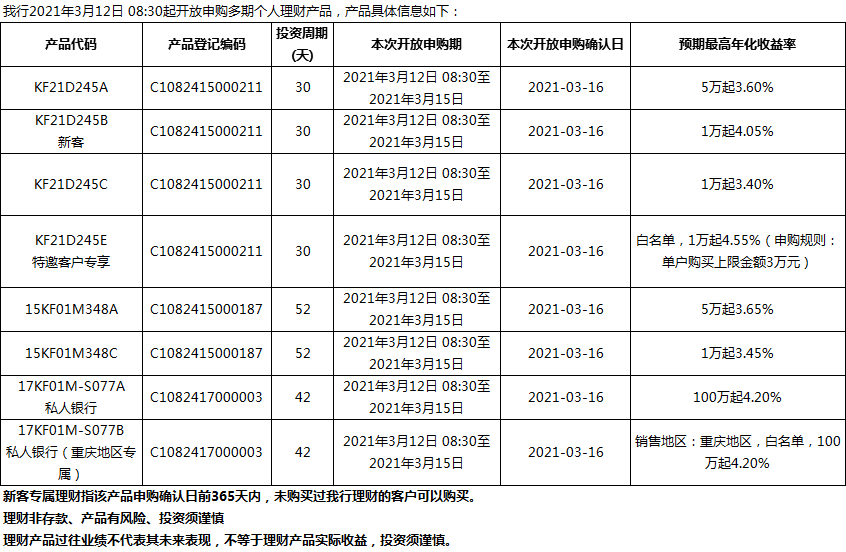 “鳳凰花”理財產(chǎn)品2021年3月12日發(fā)售信息