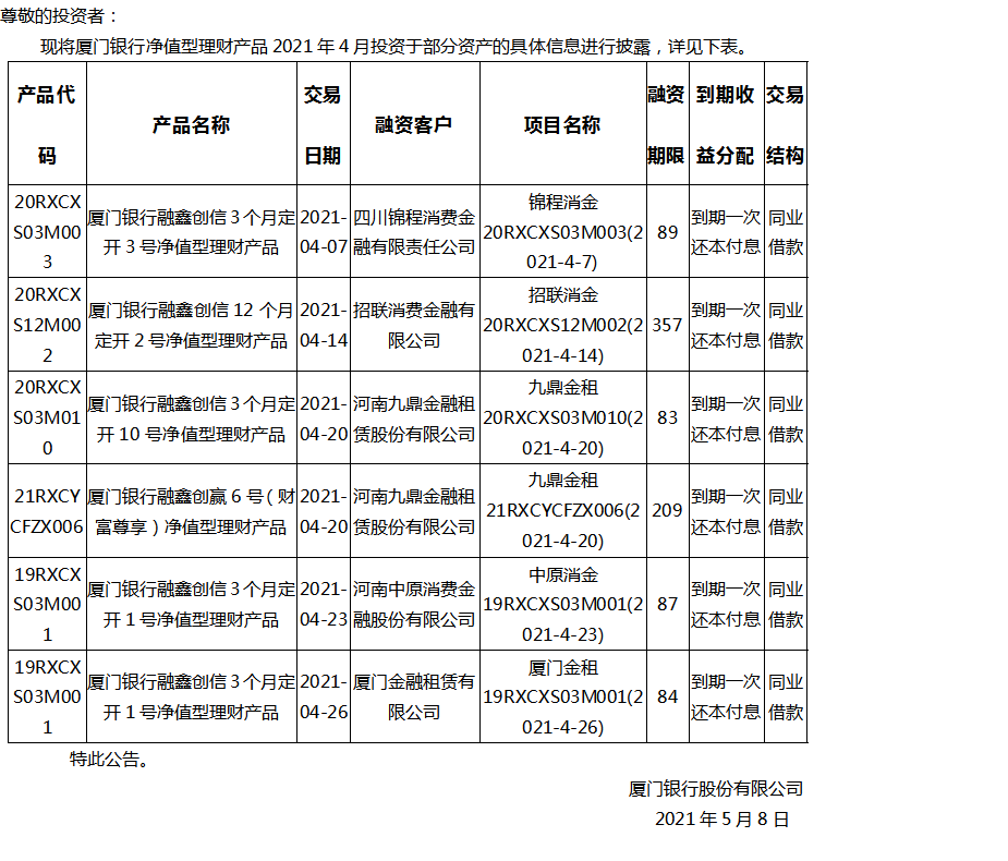 關(guān)于廈門銀行凈值型理財產(chǎn)品2021年4月投資部分資產(chǎn)的公告