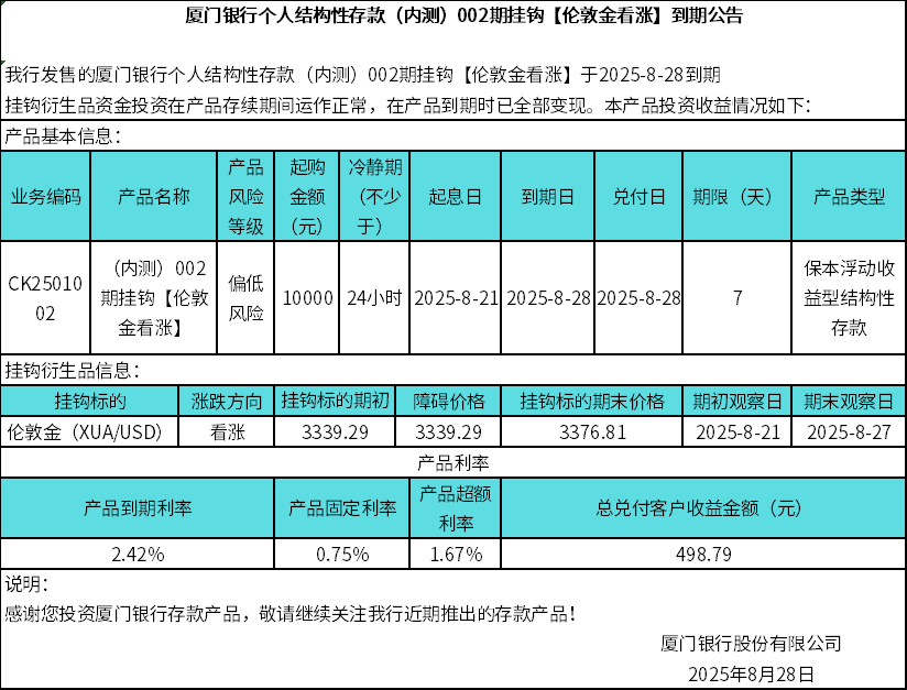 廈門銀行個人結構性存款(內測)002期掛鉤【倫敦金看漲】到期公告