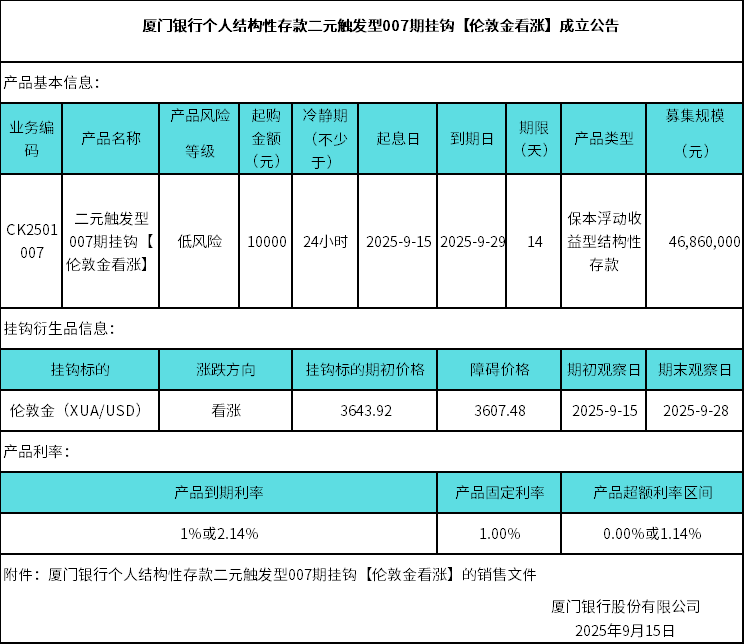廈門(mén)銀行個(gè)人結(jié)構(gòu)性存款二元觸發(fā)型007期掛鉤【倫敦金看漲】成立公告 日期:2025-09-15 15:35:46 廈門(mén)銀行個(gè)人結(jié)構(gòu)性存款二元觸發(fā)型007期掛鉤【倫敦金看漲】銷(xiāo)售文件.zip 返回 下一篇
