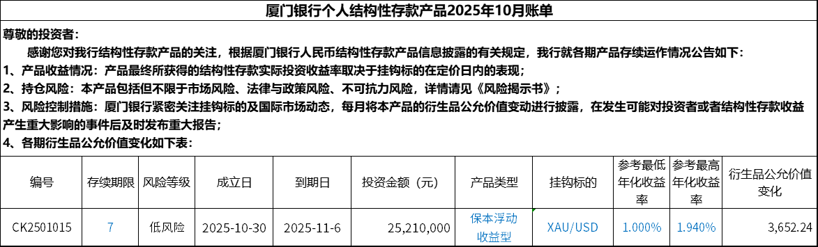 廈門(mén)銀行個(gè)人結(jié)構(gòu)性存款產(chǎn)品2025年10月賬單