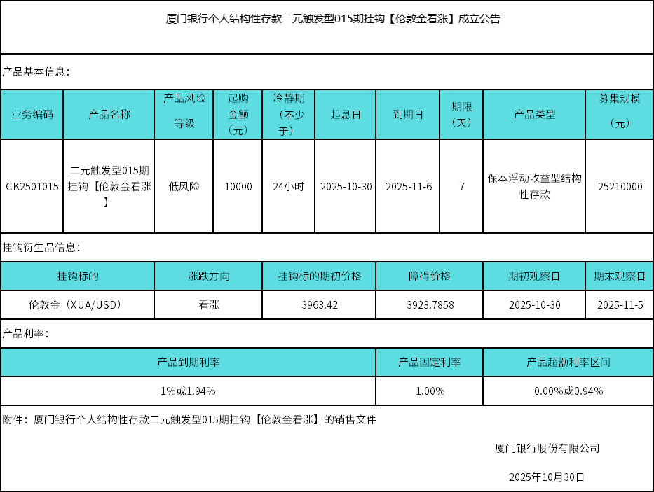廈門銀行個人結構性存款二元觸發(fā)型015期掛鉤【倫敦金看漲】成立公告 日期:2025-11-04 16:24:21 廈門銀行個人結構性存款二元觸發(fā)型015期掛鉤【倫敦金看漲】銷售文件.zip 上一篇 返回 下一篇