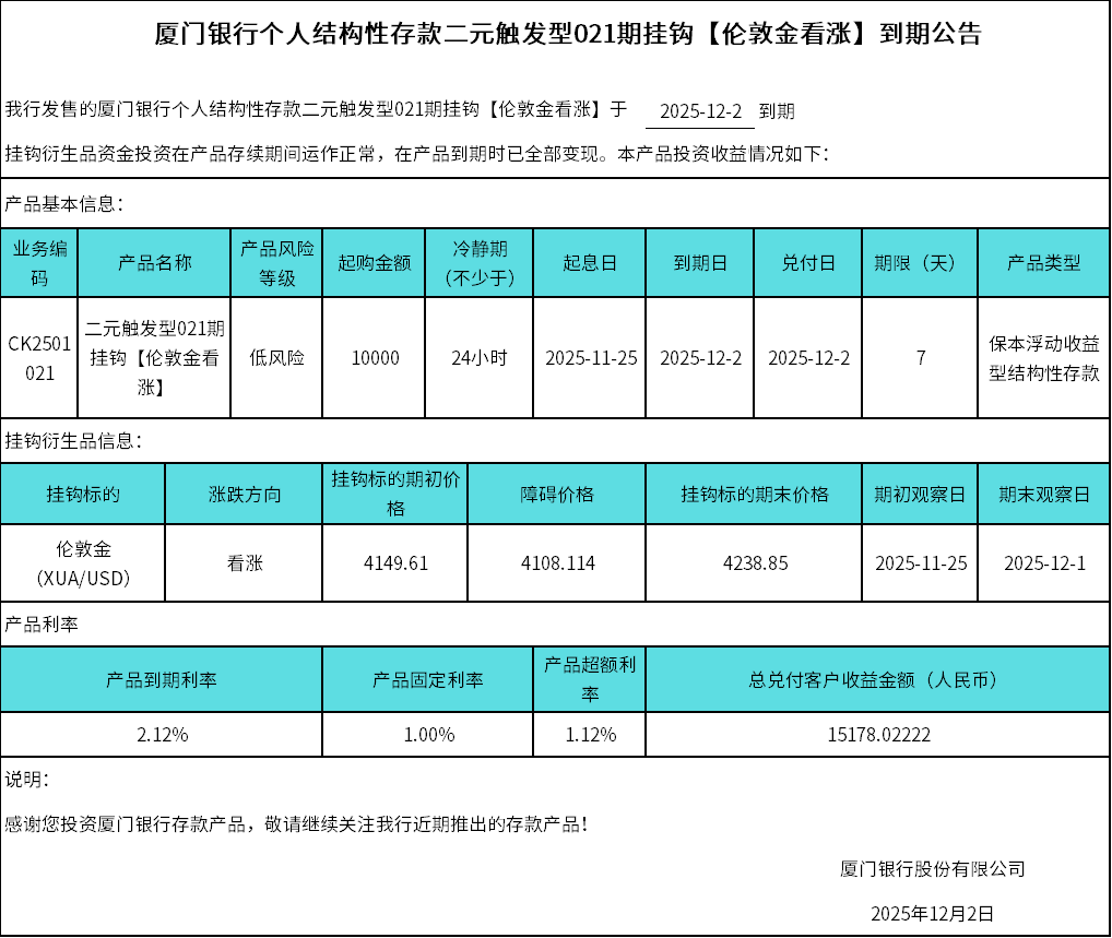 廈門銀行個(gè)人結(jié)構(gòu)性存款二元觸發(fā)型021期掛鉤【倫敦金看漲】到期公告