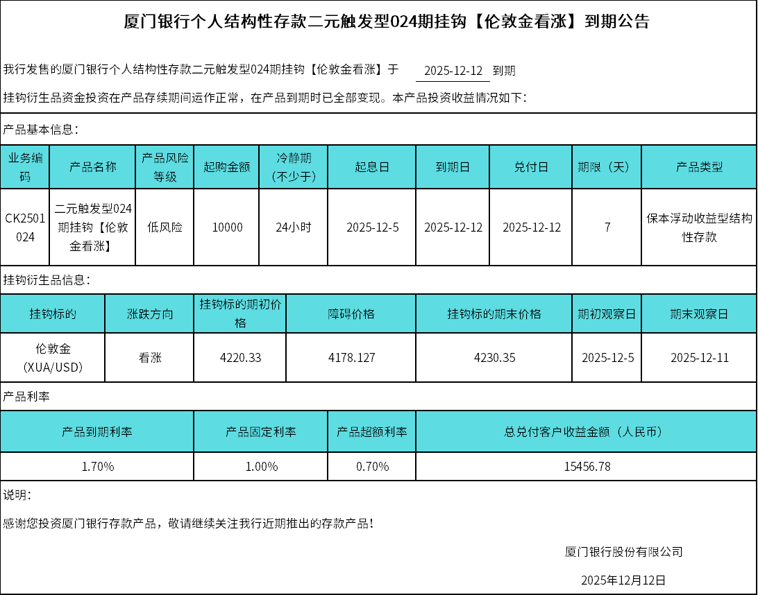 廈門銀行個(gè)人結(jié)構(gòu)性存款二元觸發(fā)型024期掛鉤【倫敦金看漲】到期公告