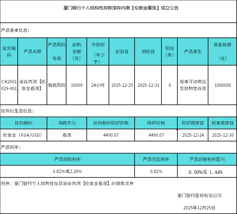 廈門銀行個(gè)人結(jié)構(gòu)性存款滾存內(nèi)測(cè)【倫敦金看漲】成立公告 日期:2025-12-25 18:26:55 廈門銀行個(gè)人結(jié)構(gòu)性存款二元觸發(fā)型029-001期掛鉤【倫敦金看漲】銷售文件.zip 返回 下一篇