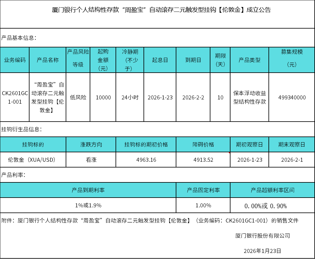 廈門(mén)銀行個(gè)人結(jié)構(gòu)性存款“周盈寶”自動(dòng)滾存二元觸發(fā)型掛鉤【倫敦金】成立公告