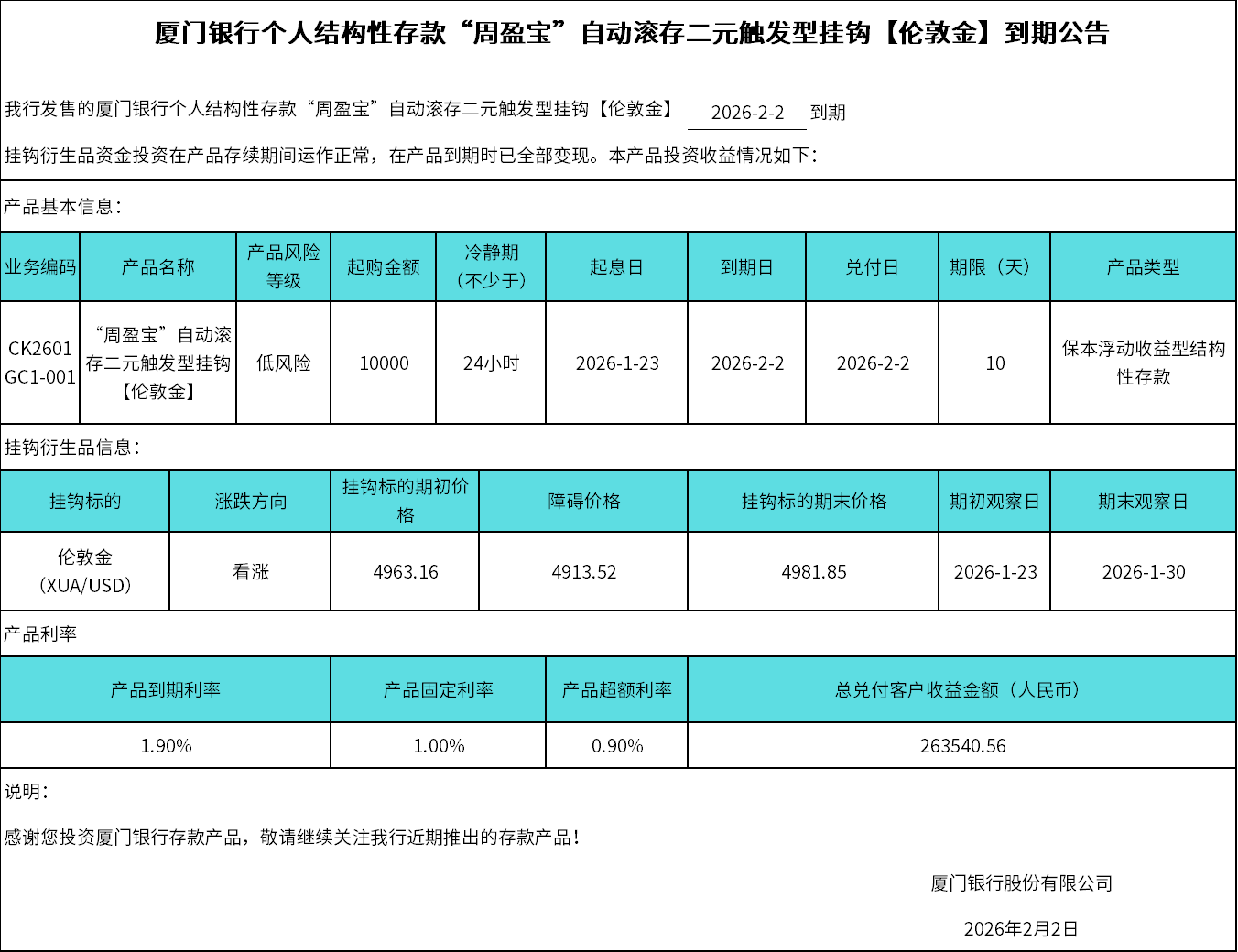 廈門銀行個人結(jié)構(gòu)性存款“周盈寶”自動滾存二元觸發(fā)型掛鉤【倫敦金】到期公告