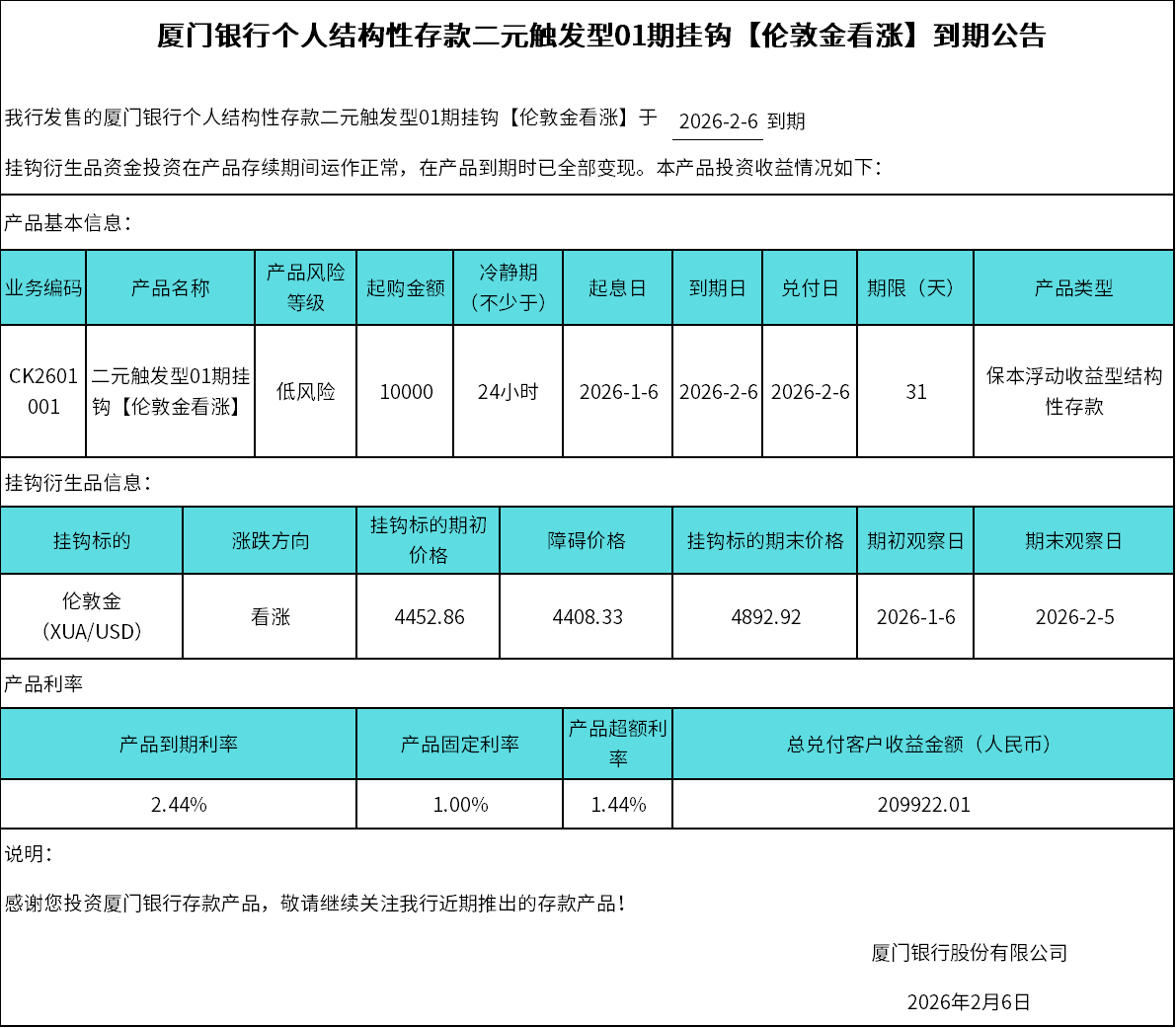 廈門銀行個人結(jié)構(gòu)性存款二元觸發(fā)型01期掛鉤【倫敦金看漲】到期公告