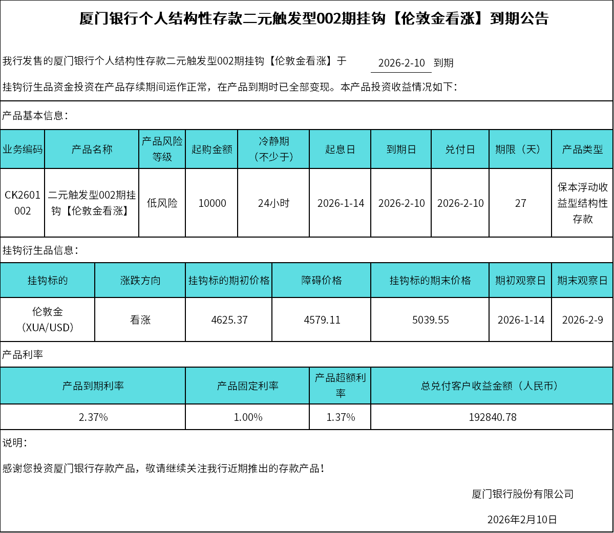 廈門銀行個(gè)人結(jié)構(gòu)性存款二元觸發(fā)型002期掛鉤【倫敦金看漲】到期公告