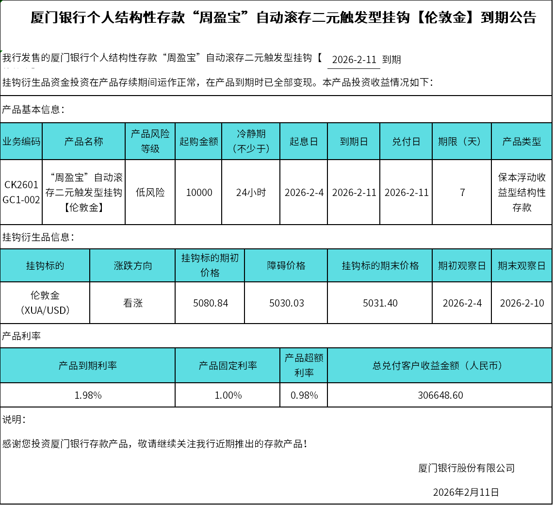 廈門銀行個(gè)人結(jié)構(gòu)性存款“周盈寶”自動(dòng)滾存二元觸發(fā)型掛鉤【倫敦金】到期公告
