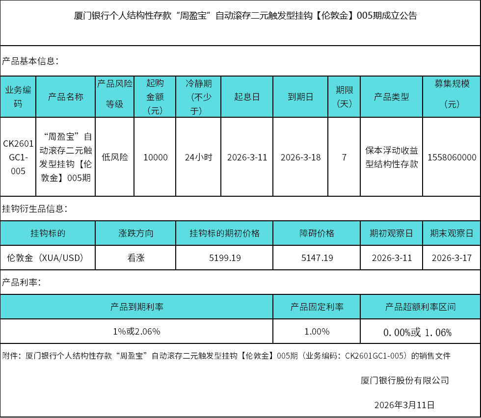 廈門銀行個(gè)人結(jié)構(gòu)性存款“周盈寶”自動(dòng)滾存二元觸發(fā)型掛鉤【倫敦金】005期成立公告 日期:2026-03-11 15:36:32 廈門銀行個(gè)人結(jié)構(gòu)性存款二元觸發(fā)型CK2601GC1-005期掛鉤【倫敦金看漲】銷售文件.zip 返回 下一篇