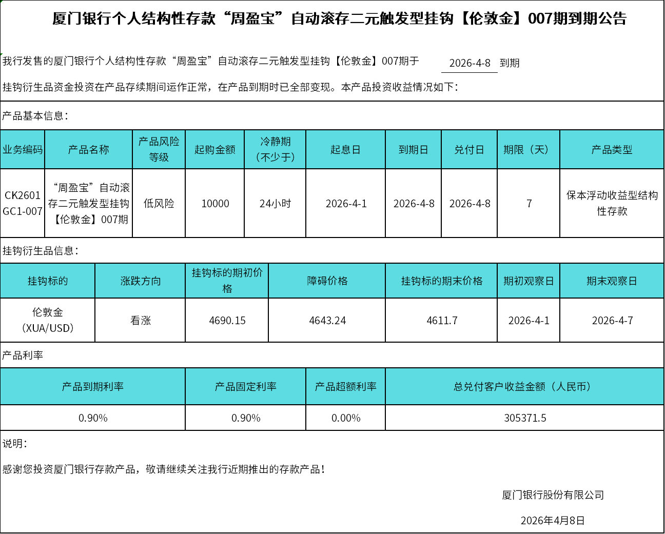 廈門銀行個(gè)人結(jié)構(gòu)性存款“周盈寶”自動(dòng)滾存二元觸發(fā)型掛鉤【倫敦金】007期到期公告
