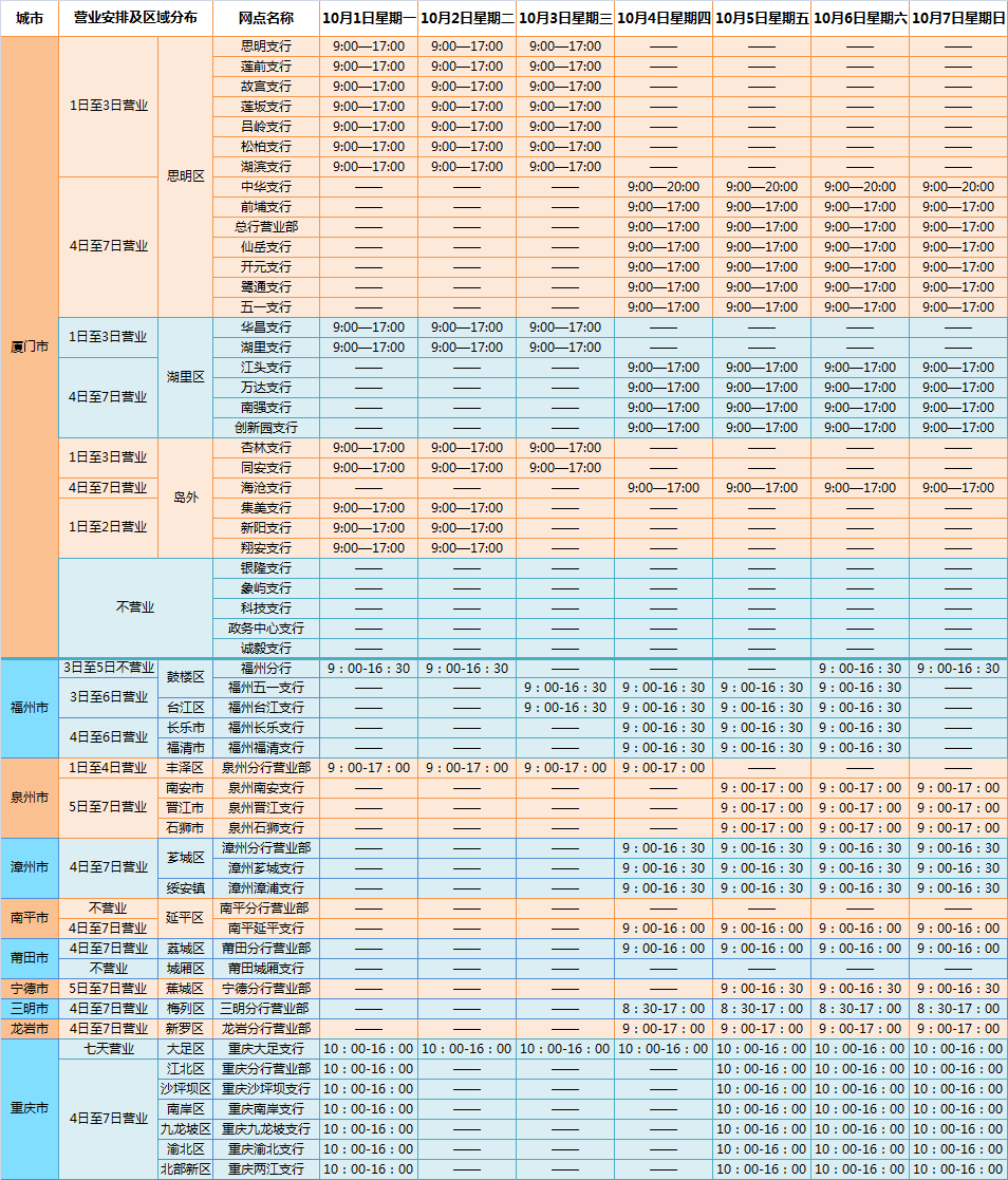 【注1:“——”表示不營業(yè);2:廈門銀行客服熱線400-858-8888;注3:廈門銀行各網(wǎng)點(diǎn)地址及聯(lián)系電話,請點(diǎn)擊鏈接: http://www.xmbankonline.com/map.jspx】