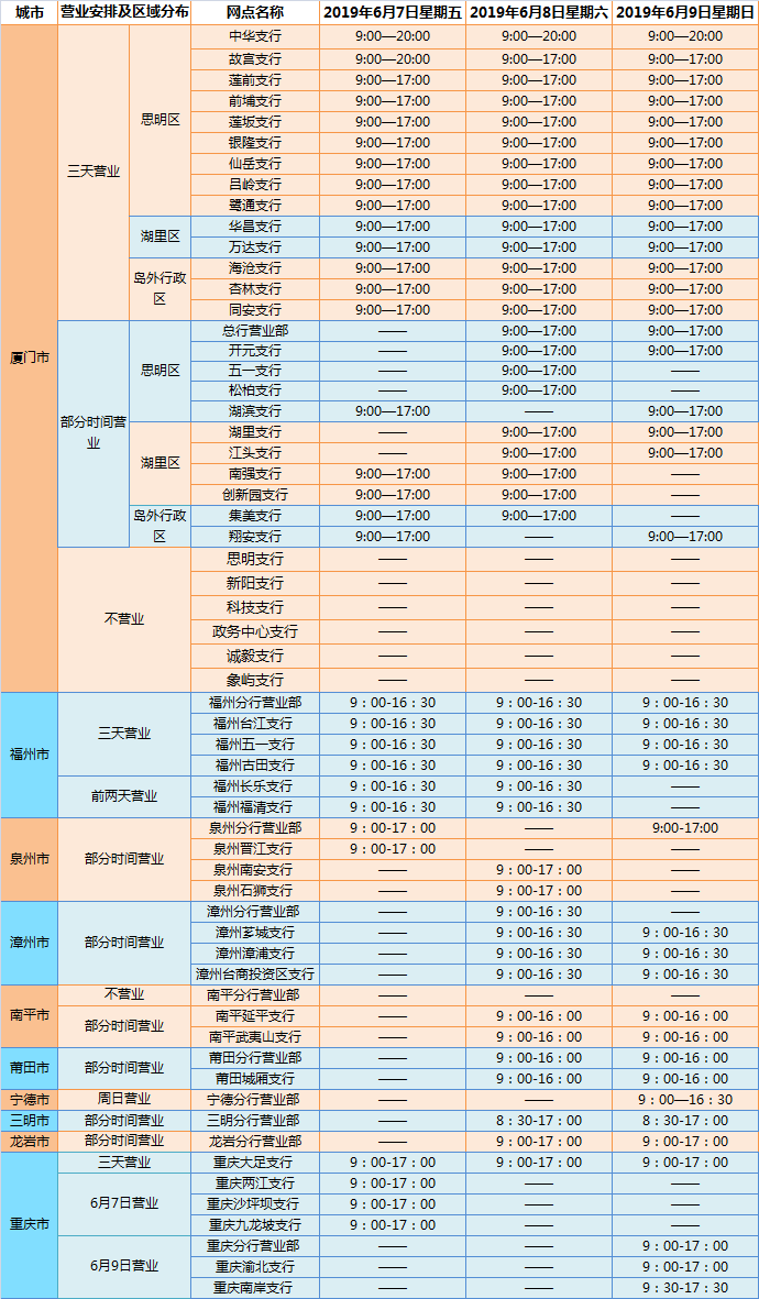【注1:“——”表示不營業(yè);2:廈門銀行客服熱線400-858-8888;注3:廈門銀行各網(wǎng)點地址及聯(lián)系電話,請點擊鏈接: http://www.xmbankonline.com/map.jspx】