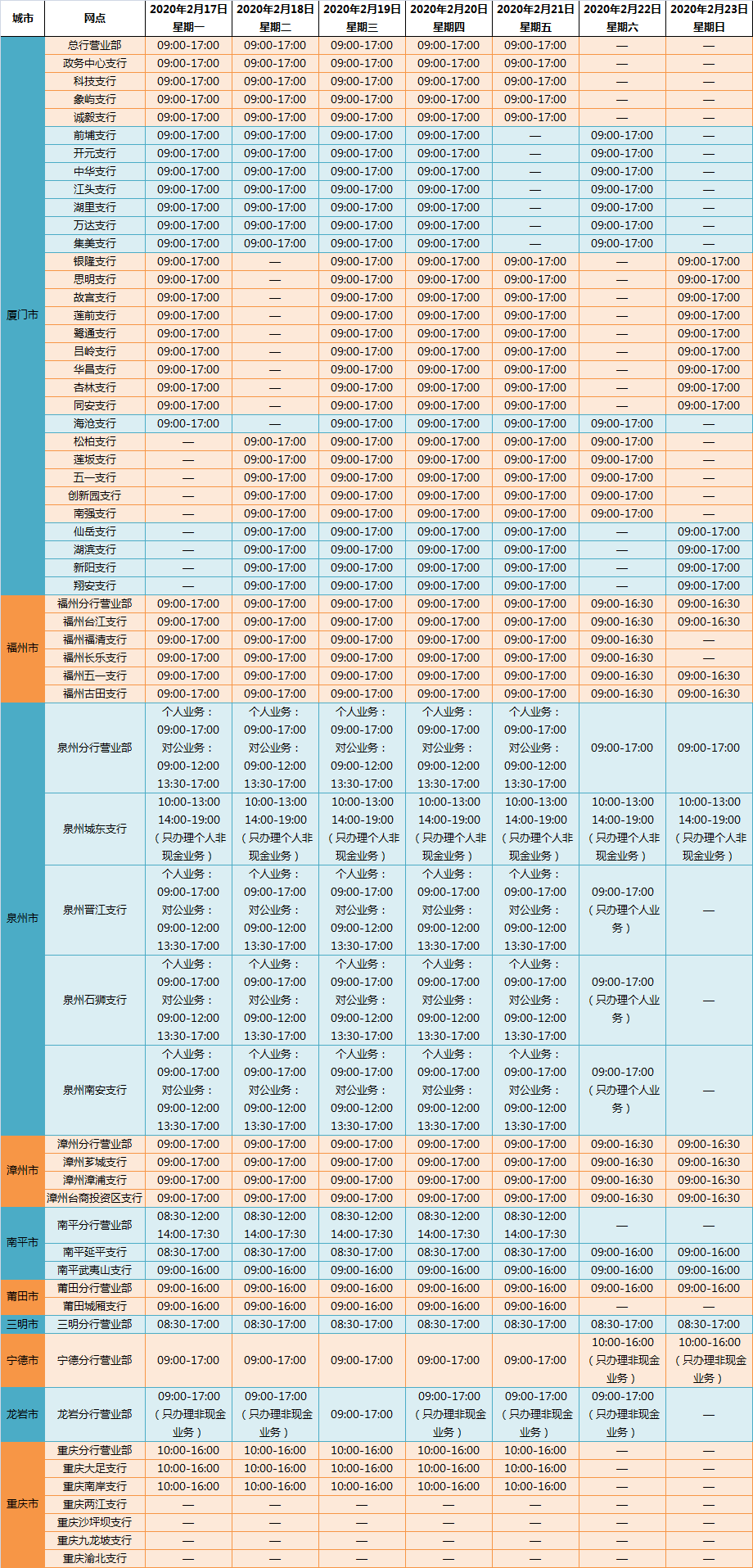 您好!未來(lái)一周(2020年2月17日-23日)為配合做好疫情防控工作,并結(jié)合我行各分支機(jī)構(gòu)所在地實(shí)際情況,現(xiàn)就廈門銀行2020年2月17日-23日各網(wǎng)點(diǎn)營(yíng)業(yè)時(shí)間做如下安排,如營(yíng)業(yè)時(shí)間安排有進(jìn)一步變化,我行將及時(shí)公布信息,敬請(qǐng)留意。