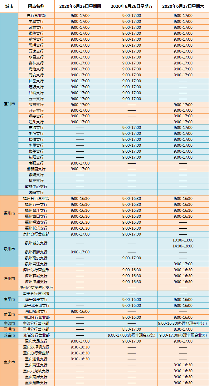 廈門銀行2020端午節(jié)假期網(wǎng)點(diǎn)對(duì)外營業(yè)時(shí)間通告