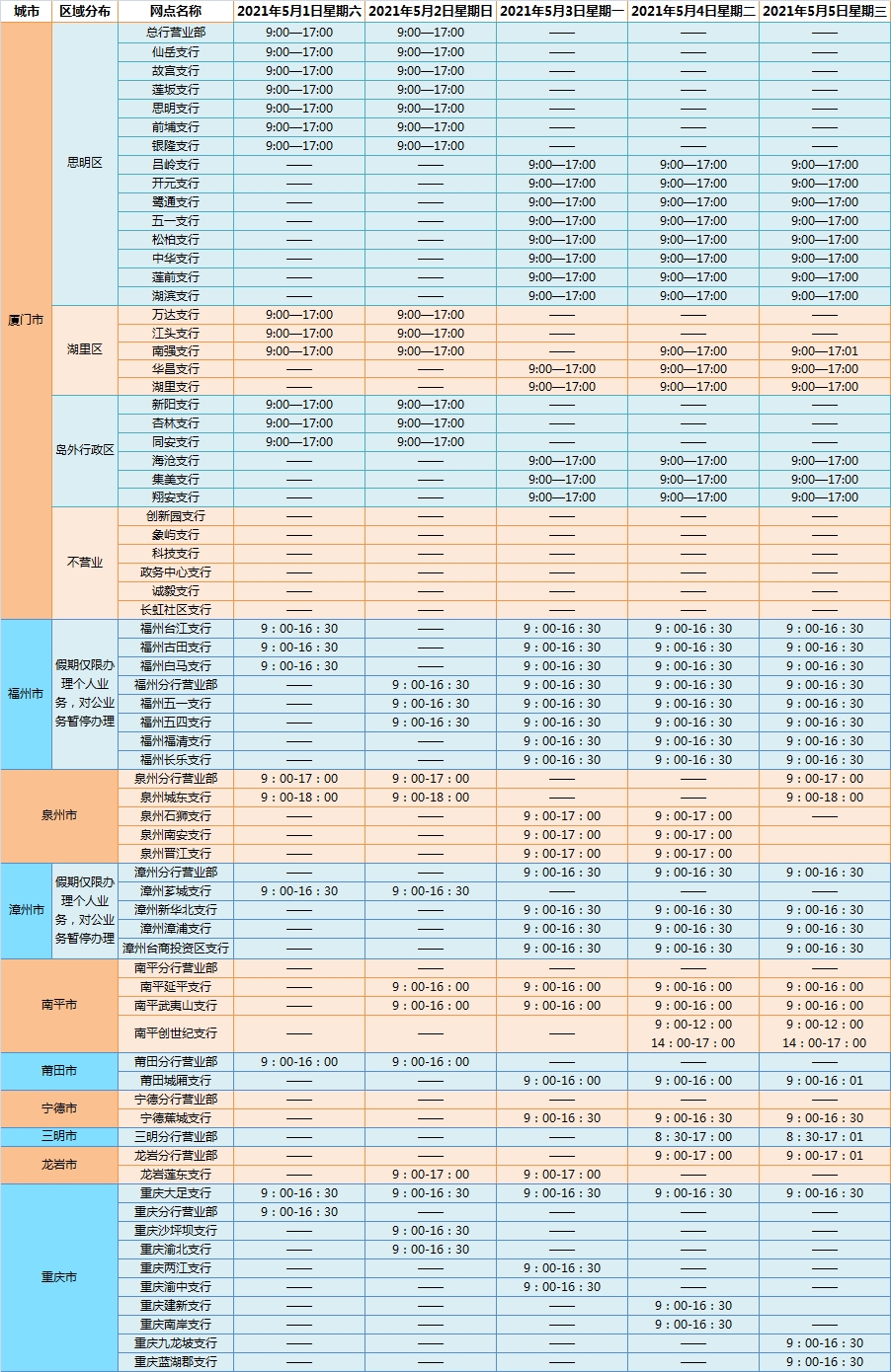 廈門銀行2021年勞動節(jié)假期網(wǎng)點對外營業(yè)時間通告