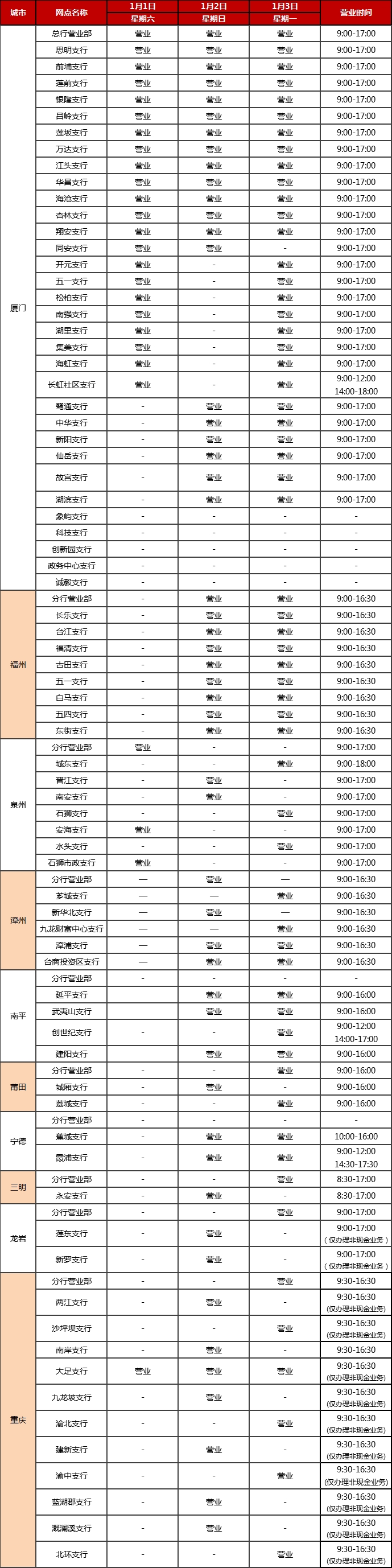 廈門(mén)銀行2022年元旦假期網(wǎng)點(diǎn)對(duì)外營(yíng)業(yè)時(shí)間通告