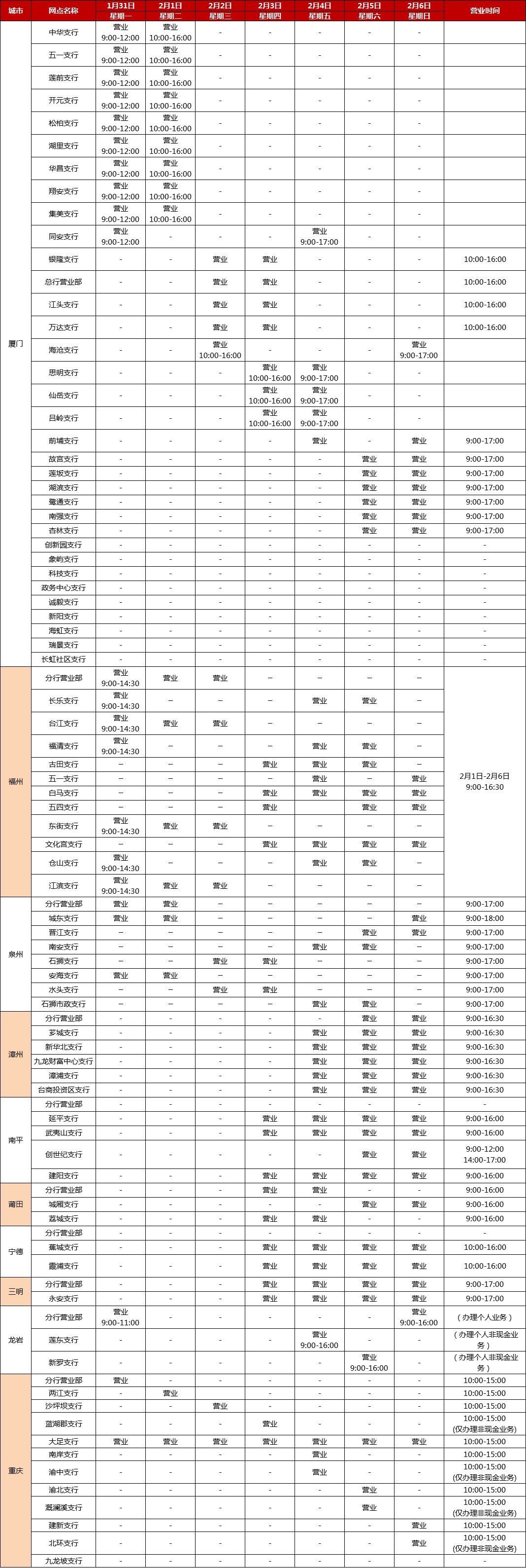 廈門銀行2022年春節(jié)假期網(wǎng)點(diǎn)對外營業(yè)時間通告