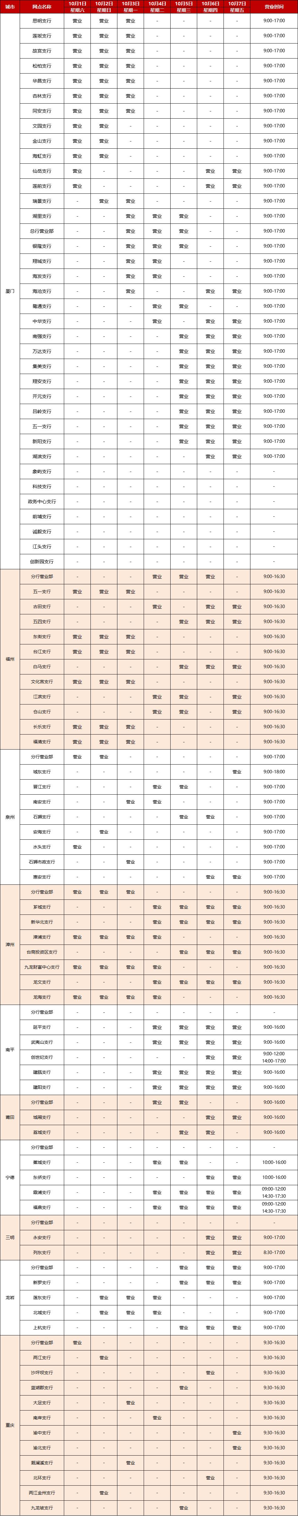廈門銀行2022國慶節(jié)假期網(wǎng)點對外營業(yè)時間通告