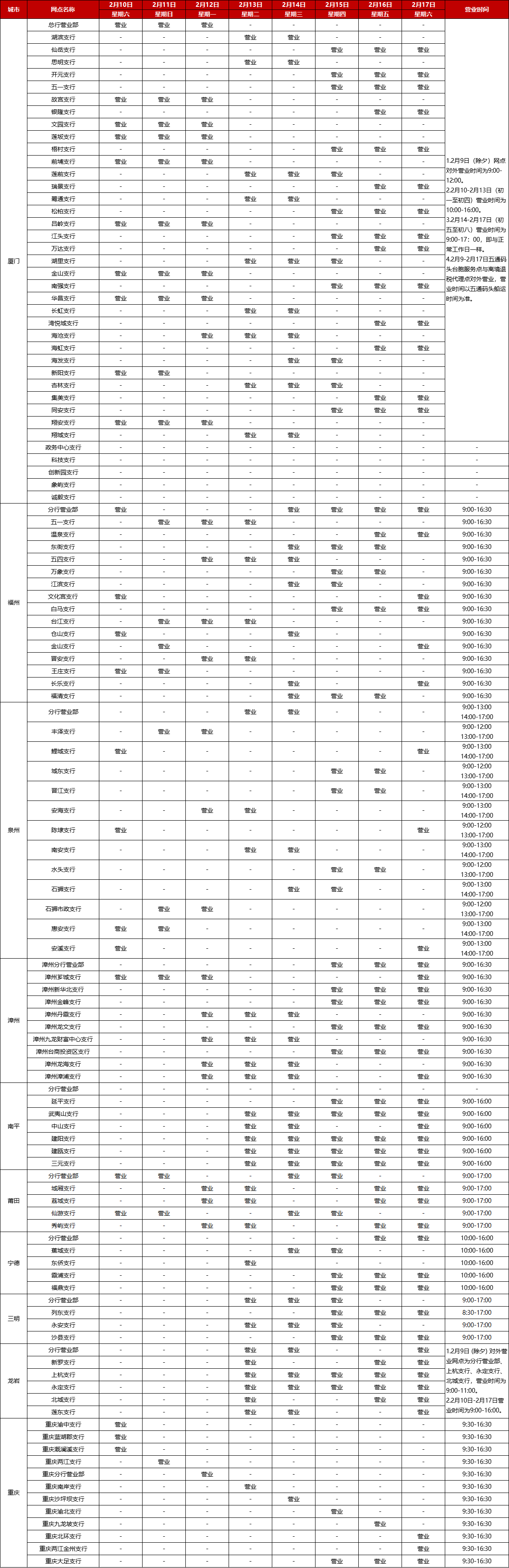 廈門銀行2024年春節(jié)假期網(wǎng)點(diǎn)對(duì)外營(yíng)業(yè)時(shí)間通告