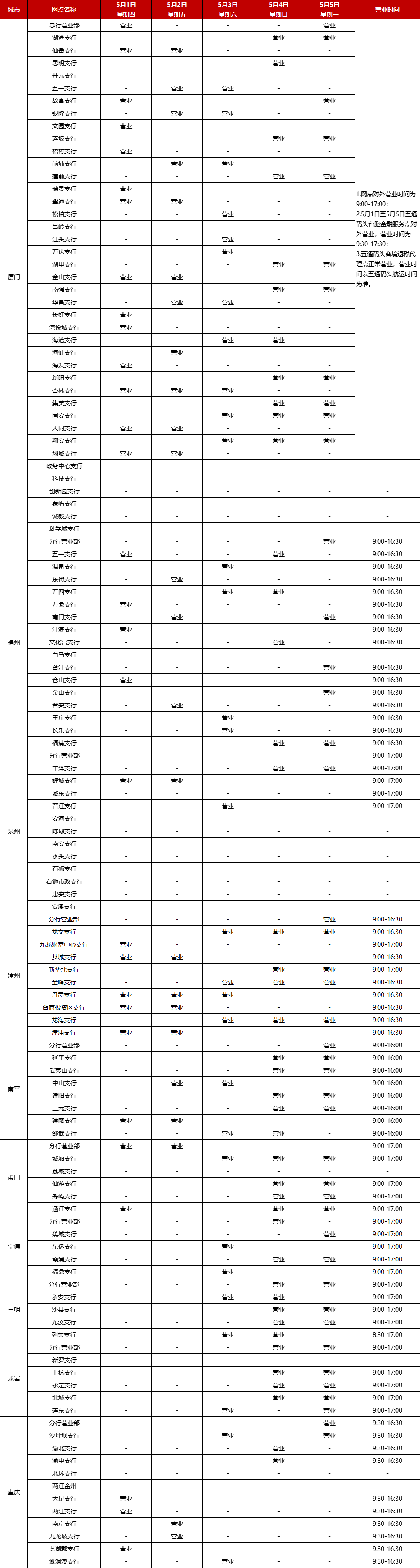廈門銀行2025年勞動節(jié)假期網(wǎng)點(diǎn)對外營業(yè)時間通告
