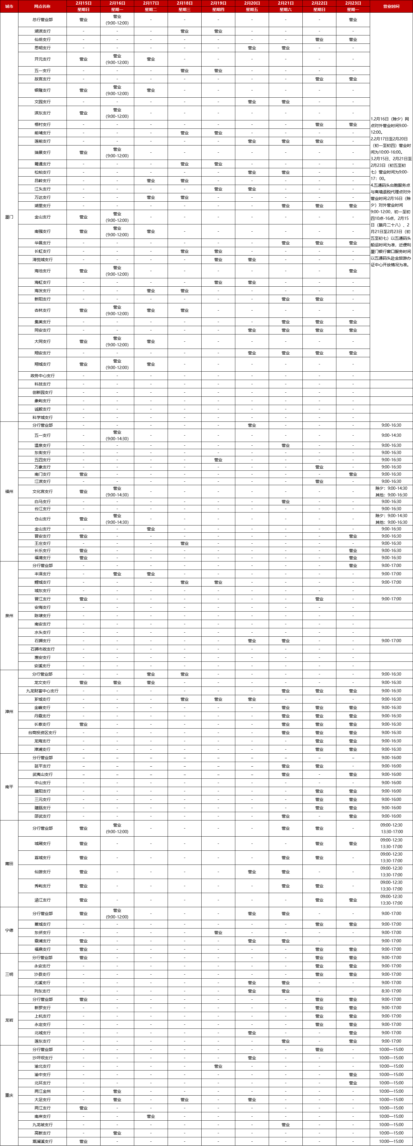 廈門銀行2026年春節(jié)假期網(wǎng)點(diǎn)對(duì)外營(yíng)業(yè)時(shí)間通告