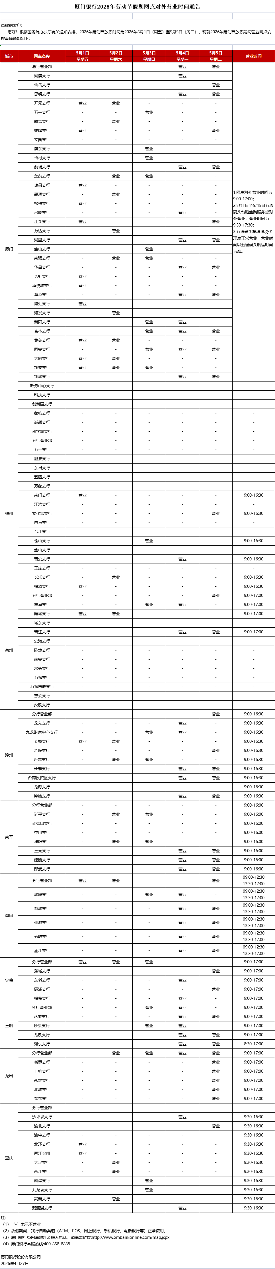 廈門(mén)銀行2026年五一假期網(wǎng)點(diǎn)對(duì)外營(yíng)業(yè)時(shí)間通告
