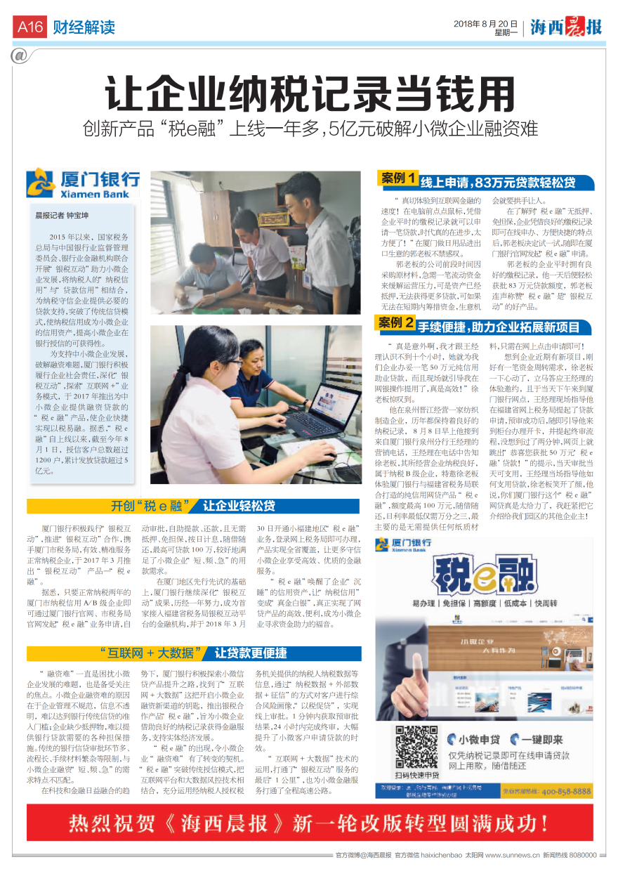 為支持中小微企業(yè)發(fā)展,破解融資難題,廈門銀行積極履行企業(yè)社會責(zé)任,深化“銀稅互動”,探索“互聯(lián)網(wǎng)+”業(yè)務(wù)模式,于2017年推出為中小微企業(yè)提供融資貸款的“稅e融”產(chǎn)品,使企業(yè)快捷實(shí)現(xiàn)以稅易融。據(jù)悉,“稅e融”自上線以來,截至今年8月1日,授信客戶總數(shù)超過1200戶,累計發(fā)放貸款超過5億元。