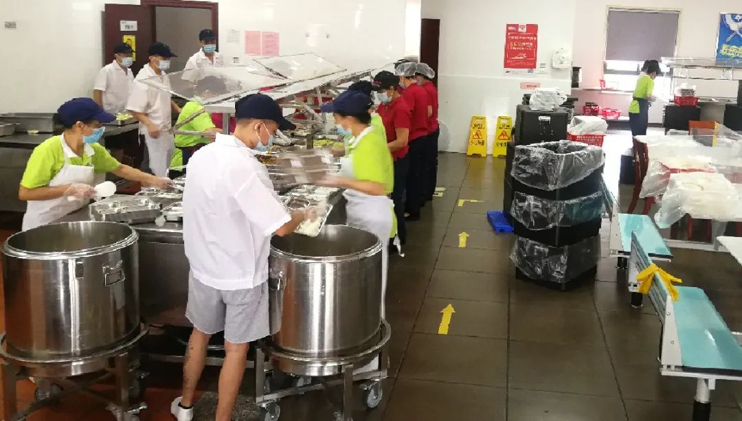 ▲廈門銀行食堂工作人員正在分裝午餐,協(xié)助做好分流用餐工作