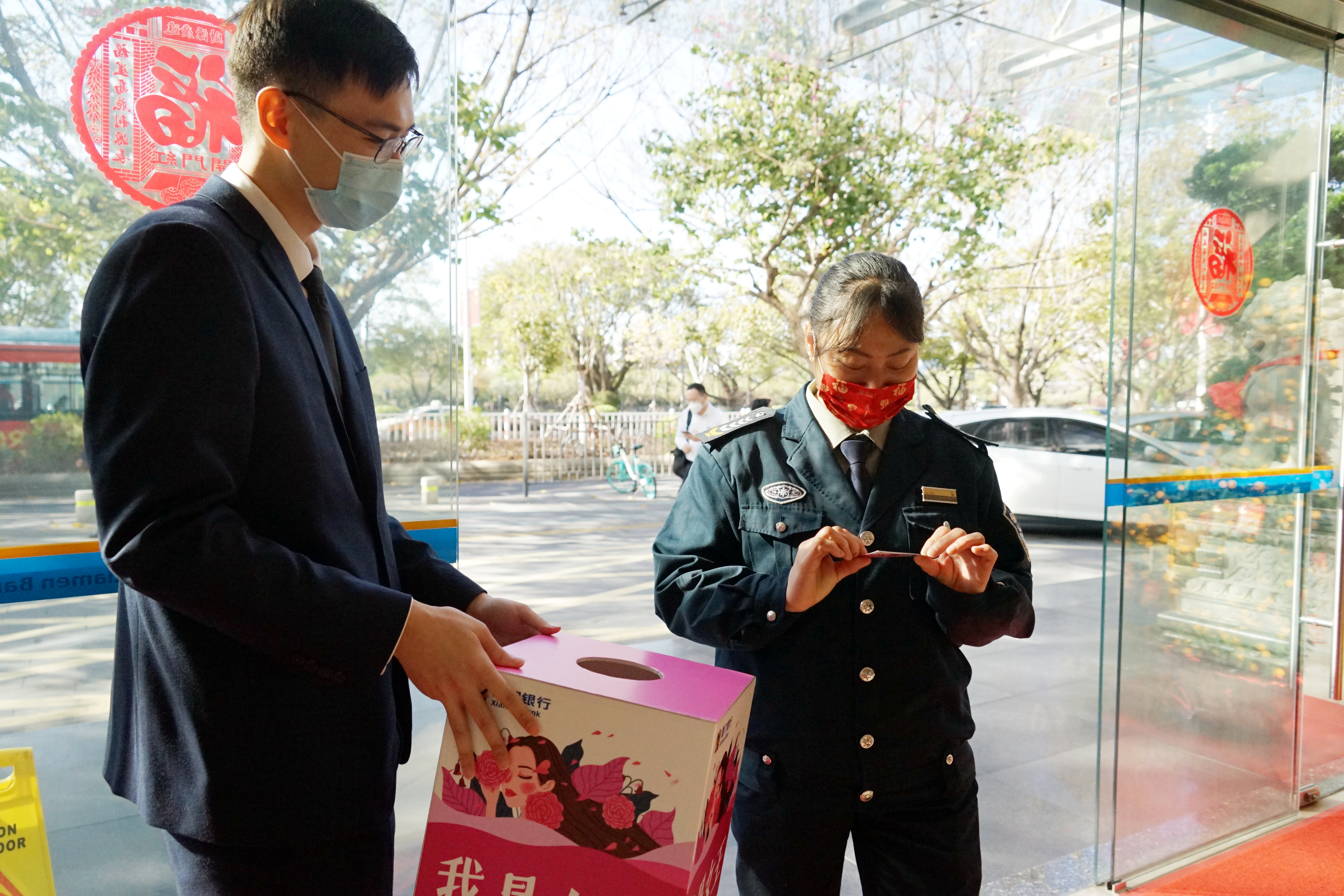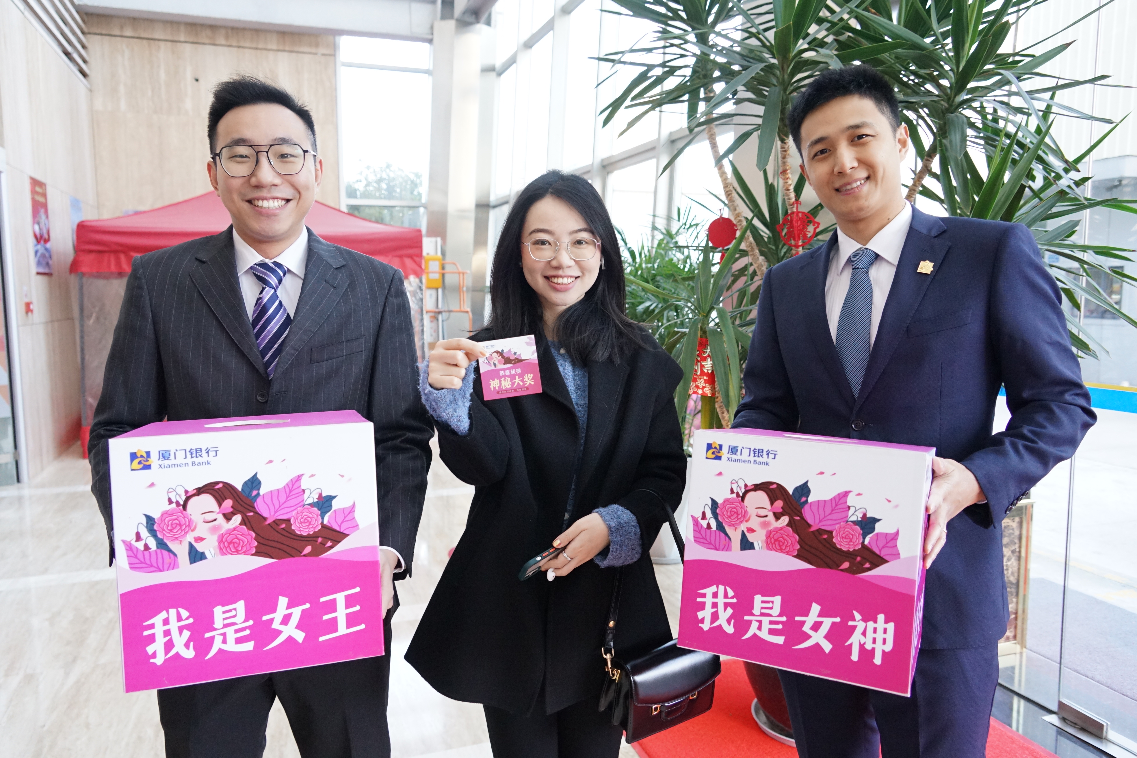 當女神們步入廈門銀行,六個帥小伙紛紛上前,致以節(jié)日問候,并遞上抽獎箱~考驗手氣的時候到啦!