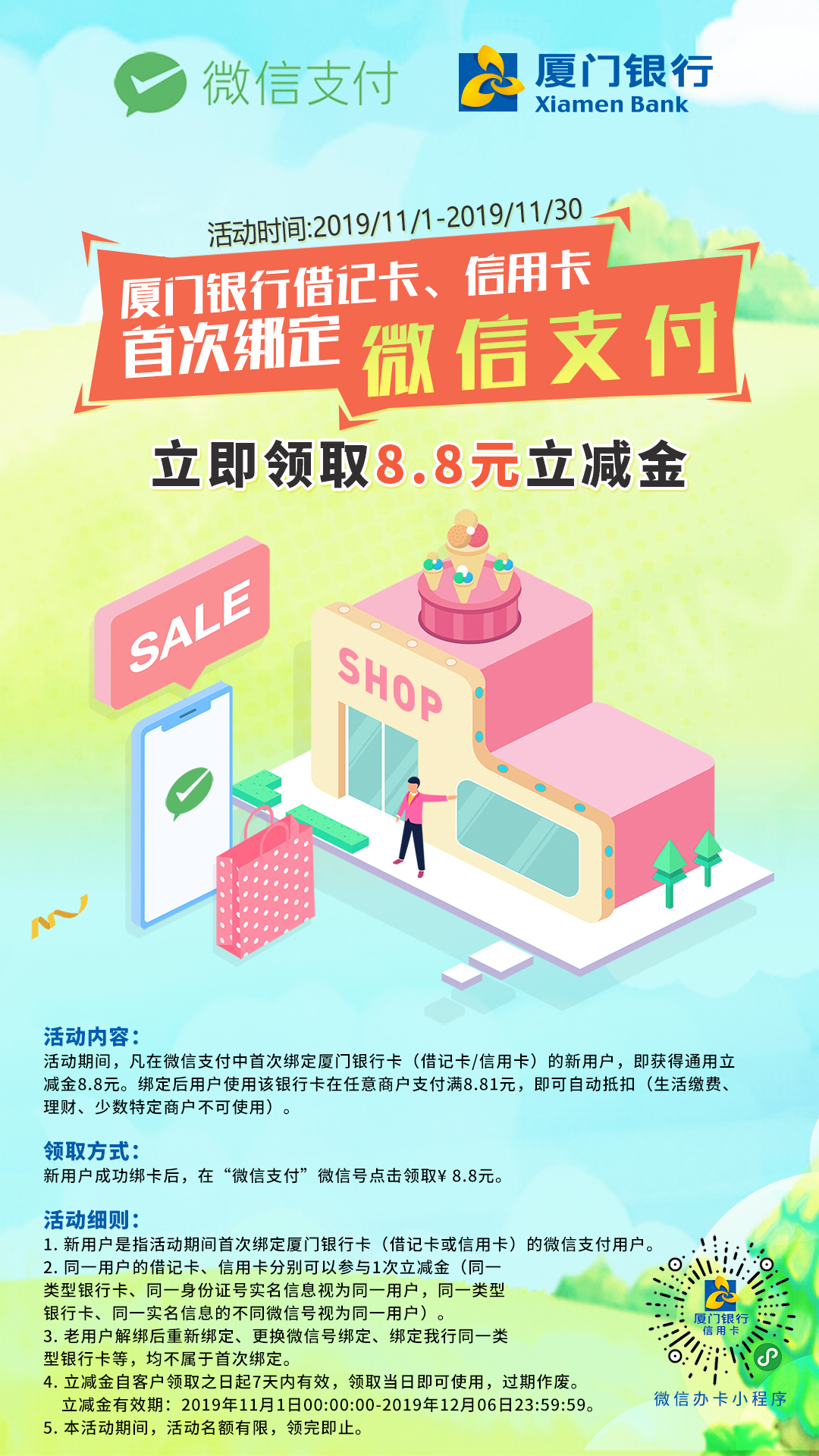 微信首綁廈門銀行信用卡或借記卡,送8.8元立減金