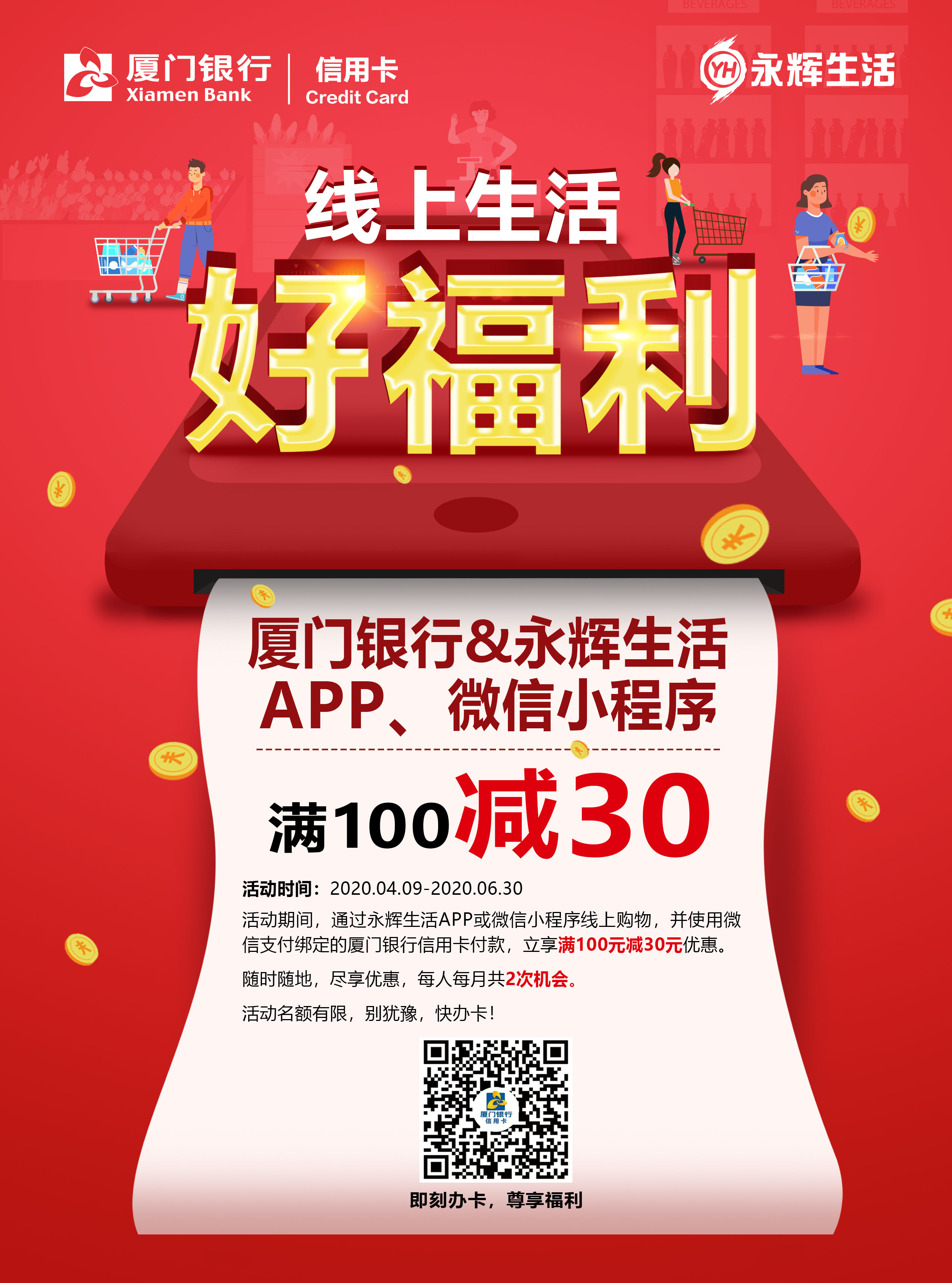 滿100-30!廈門銀行&永輝生活線上(APP及微信小程序)送好禮
