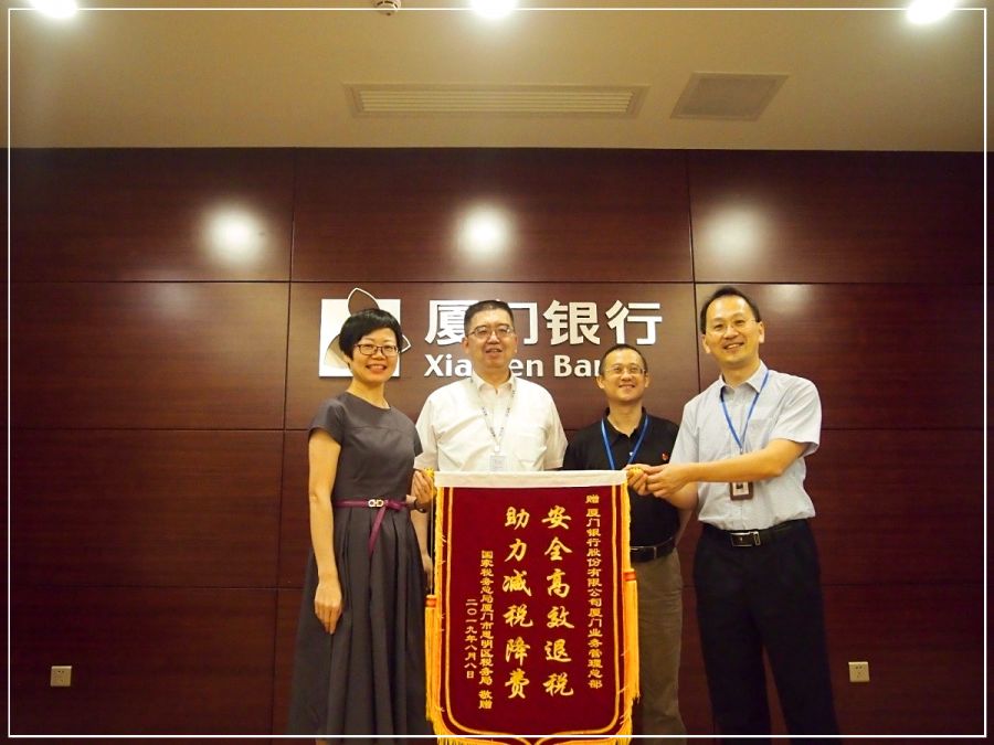 2019年8月15日下午,廈門銀行廈門業(yè)務(wù)管理總部收到了一面很有意義的錦旗。廈門市稅務(wù)局收規(guī)處副處長(zhǎng)陳向群,思明區(qū)稅務(wù)局副局長(zhǎng)高燕槐及思明區(qū)稅務(wù)局收入核算科、辦公室一行5人特意到我行舉行授旗儀式并送來感謝信。感謝我行對(duì)“減稅降費(fèi)”工作的大力支持,感謝代理支庫(kù)行開元支行克服退稅量大,加班加點(diǎn),為減稅降費(fèi)政策落地生根,助力思明區(qū)經(jīng)濟(jì)發(fā)展做出了重大貢獻(xiàn)。
