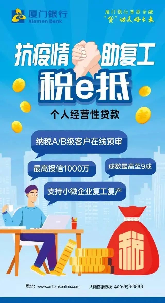自疫情防控工作開展以來,廈門銀行響應(yīng)國家政策,積極做好企業(yè)金融服務(wù)保障,全力支持企業(yè)復(fù)工復(fù)產(chǎn)、踐行普惠金融。2020年2月,廈門銀行深化落實(shí)“銀稅合作”,金融服務(wù)再升級(jí)。在稅貸的基礎(chǔ)上,結(jié)合企業(yè)稅務(wù)信息,精準(zhǔn)定位納稅A/B級(jí)企業(yè),全新推出個(gè)人經(jīng)營性抵押貸款產(chǎn)品——“稅e抵”。