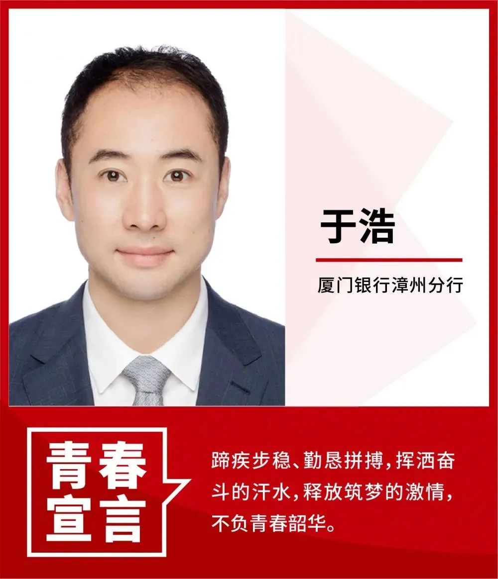 從業(yè)十余載,于浩用他不懈的奮斗,不斷演繹著廈門(mén)銀行奮勇?tīng)?zhēng)先、不甘人后的海潮文化。用他的行動(dòng)踐行著廈門(mén)銀行為客戶提供優(yōu)質(zhì)金融服務(wù)、金融支持實(shí)體經(jīng)濟(jì)的使命。放眼未來(lái),廈門(mén)銀行的青年們將繼續(xù)勠力同心,有新?lián)?dāng)、有新作為,不負(fù)新時(shí)代,不負(fù)青春韶華!