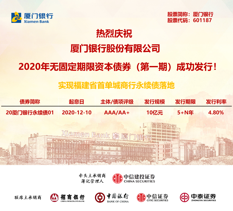 經(jīng)中國(guó)人民銀行和中國(guó)銀行保險(xiǎn)監(jiān)督管理委員會(huì)廈門監(jiān)管局批準(zhǔn),廈門銀行于1210日成功發(fā)行了10億元“2020年廈門銀行股份有限公司無(wú)固定期限資本債券(第一期)”。