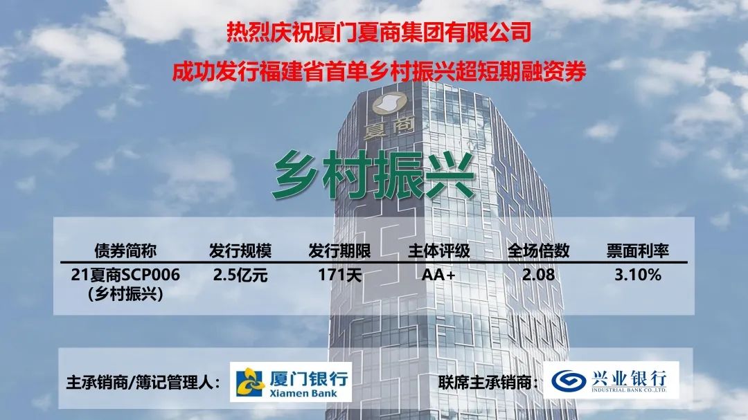廈門銀行牽頭主承銷的福建省首單鄉(xiāng)村振興超短期融資券、廈門市首單鄉(xiāng)村振興債務(wù)融資工具——廈門夏商集團(tuán)有限公司2021年度第六期超短期融資券(鄉(xiāng)村振興),于2021年5月7日成功發(fā)行。本筆債券發(fā)行規(guī)模2.5億元,期限171天發(fā)行利率僅3.10%,受到了投資人的青睞和發(fā)行人的好評。