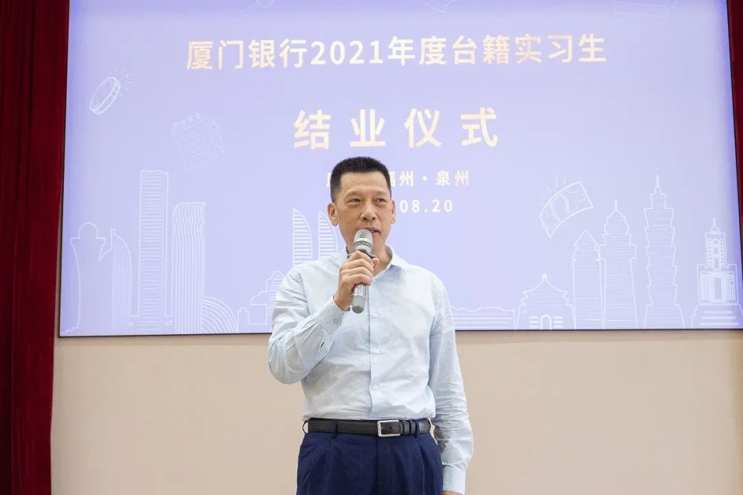 2021年8月20日,廈門銀行2021年度臺(tái)籍實(shí)習(xí)生計(jì)劃結(jié)業(yè)儀式在廈門銀行總行成功舉辦。臺(tái)籍實(shí)習(xí)生們用豐碩的實(shí)習(xí)成果為過(guò)去一個(gè)月的銀行實(shí)習(xí)之旅畫上圓滿的句號(hào)。廈門市臺(tái)港澳辦巡視員林奕田、團(tuán)市委統(tǒng)戰(zhàn)部調(diào)研員陳思敏、廈門銀保監(jiān)局外資處副處長(zhǎng)林劍波、廈門市財(cái)政局團(tuán)委書記左菁、廈門市臺(tái)港澳辦經(jīng)濟(jì)處李鋒,及廈門銀行董事長(zhǎng)吳世群、行長(zhǎng)吳昕顥、監(jiān)事長(zhǎng)張永歡、副行長(zhǎng)莊海波等領(lǐng)導(dǎo)到場(chǎng)指導(dǎo)。