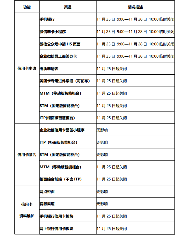 為給您提供更優(yōu)質(zhì)的服務(wù),我行將于2022年11月25日起調(diào)整信用卡申請(qǐng)、激活、信息維護(hù)的相關(guān)渠道,變更內(nèi)容詳見(jiàn)下表: